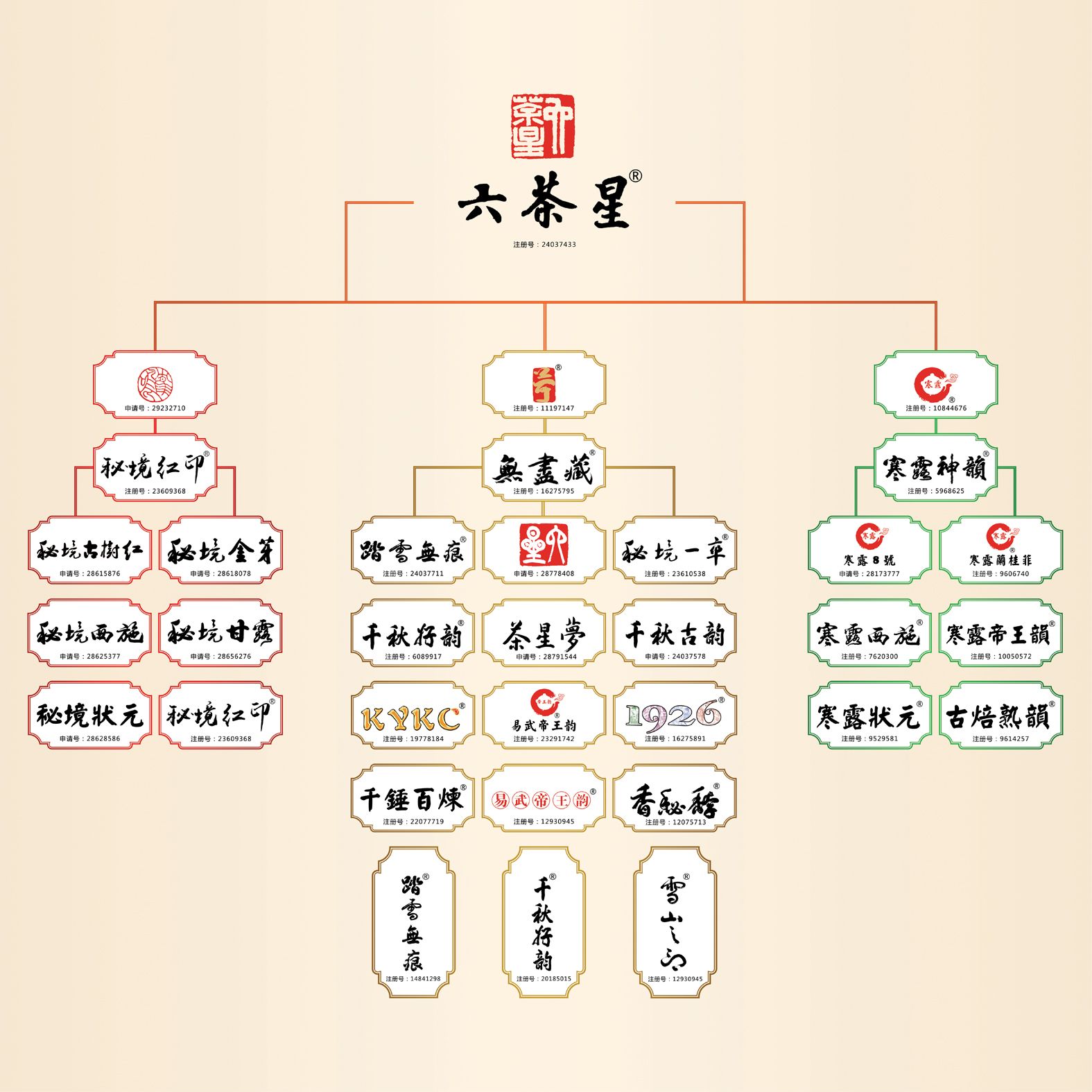 六茶星拥有自主核心品牌“号·无尽藏”普洱茶系列和“秘境红印”滇红茶系列及“寒露”铁观音系列 。
